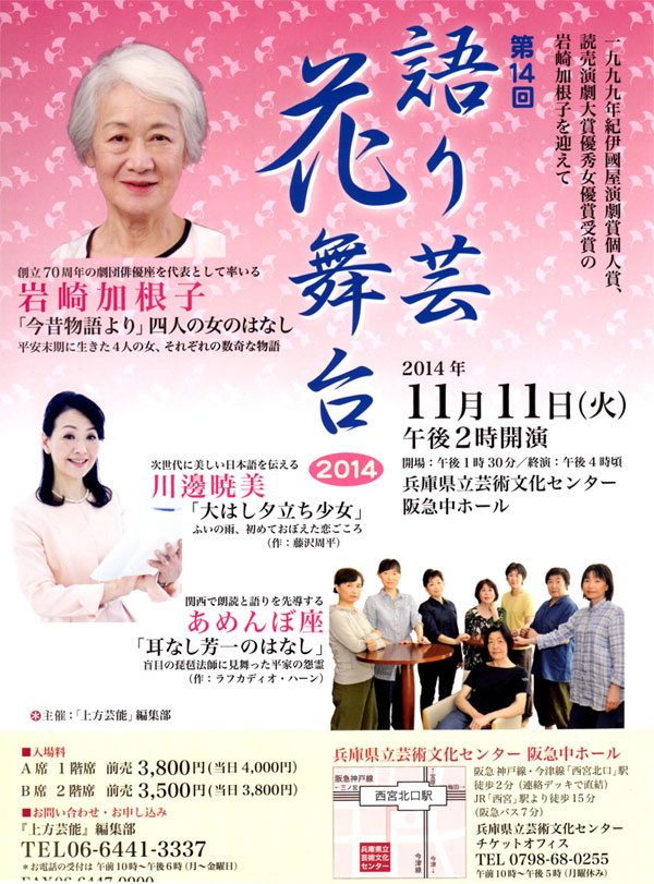 語り芸花舞台は、雑誌「上方芸能」編集部が朗読文化の振興を図るために毎年秋に開催され、今年で14回目を迎える。あめんぼ座は13回目の出演。今回の競演は岩崎加根子氏(今昔物語より」四人の女のはなし)、川邊暁美氏(藤沢周平作「大はし夕立ち少女」)。No.91(大丸心斎橋劇場)での