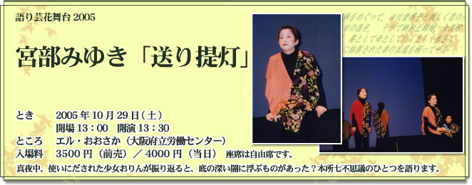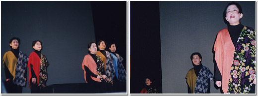 おりんに白羽の矢が立ったのは、大野屋には他に巳年生まれの女がいなかったから。 大野屋に奉公する12歳のおりんは我がままなお嬢さんのいいつけで、100個の小石を回向院から拾って来なければならない。 それも丑三つ時に一晩にひとつづつ。木枯らしに揉まれ、木立のざわめきに怯えるおりんの背後に浮かぶもの、その正体は? 意外な展開と江戸庶民の暮らしの哀愁が胸をつく人情話に朗読集団あめんぼ座の特徴を活かして取り組みました。 意表をついた演出と鮮やかな衣装、そして郡読が大好評を頂きました。
